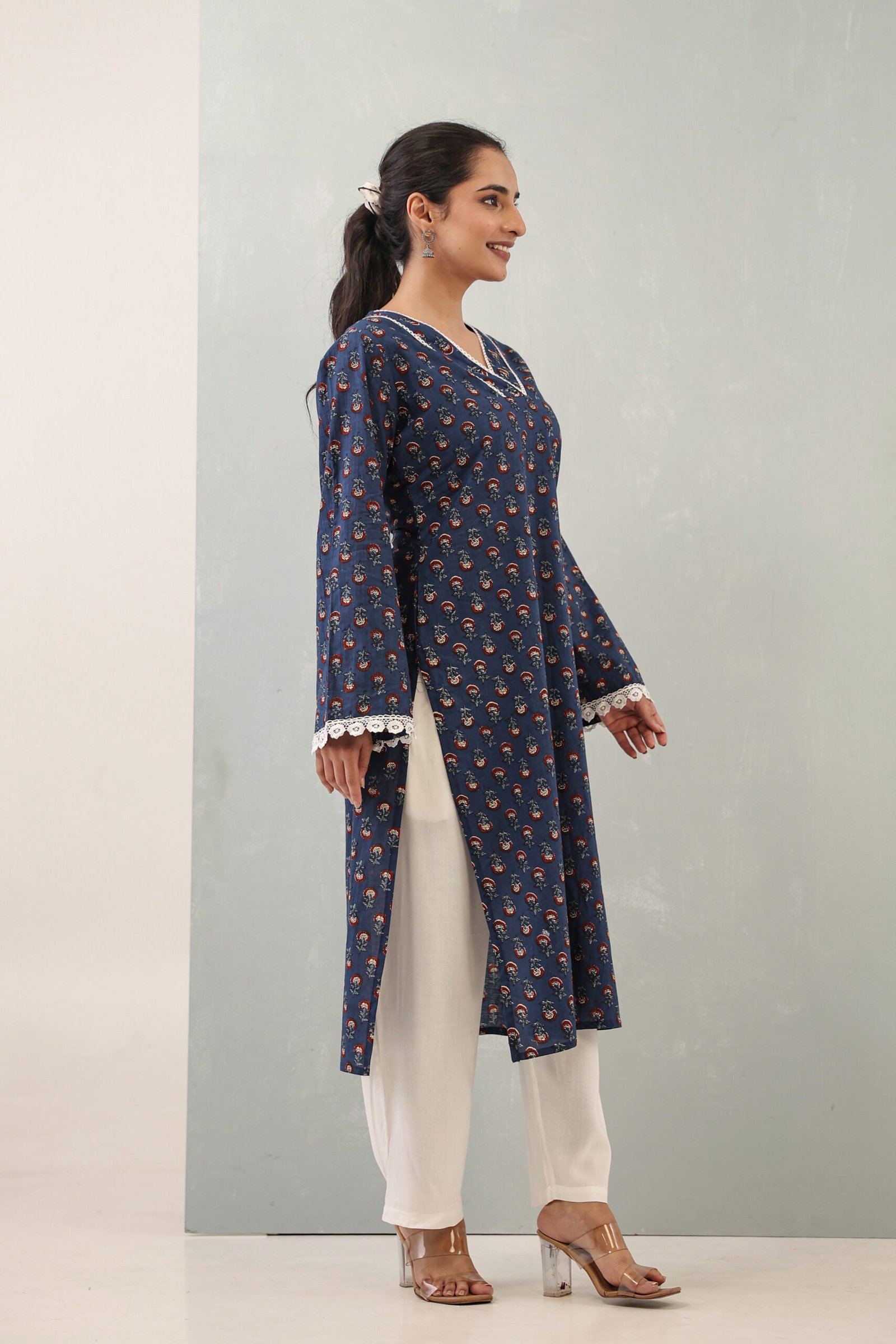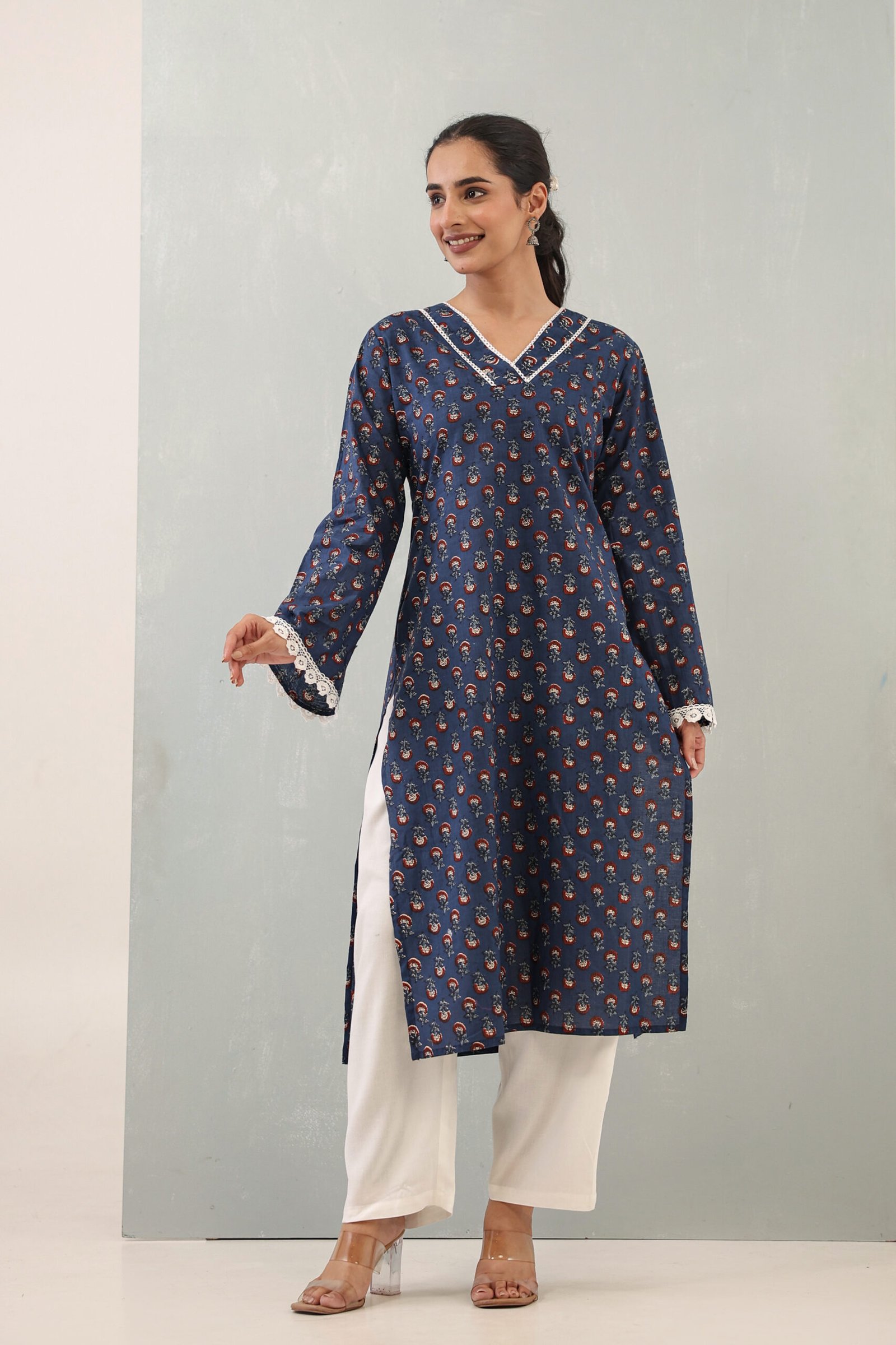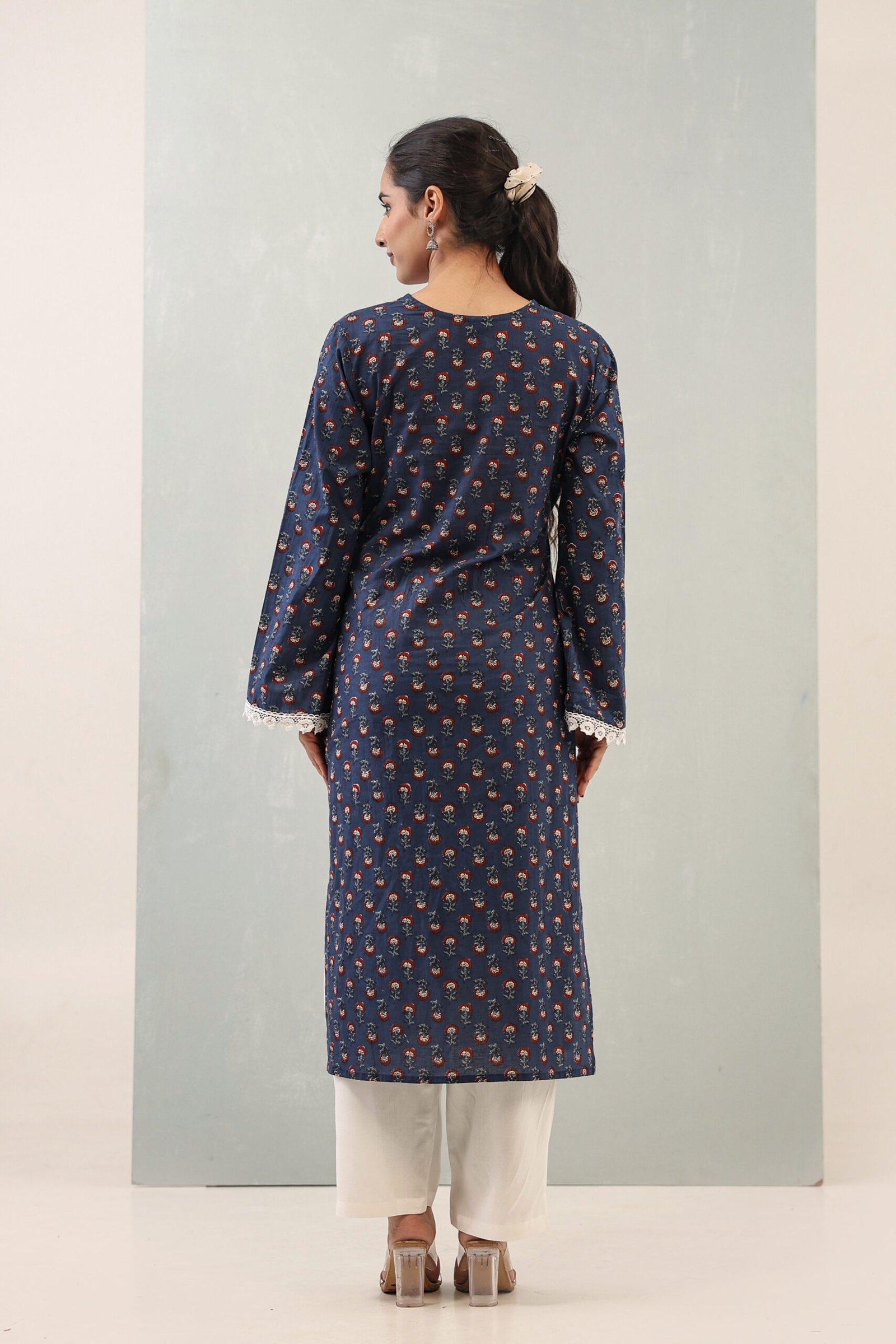 Elevate your everyday ethnic wardrobe with this Floral Printed Pakistani Kurti for Women, thoughtfully designed to blend timeless elegance with modern comfort. Crafted in a rich navy blue shade, this kurti features a flattering V-neckline enhanced with delicate lace detailing, adding a touch of sophistication to your look.