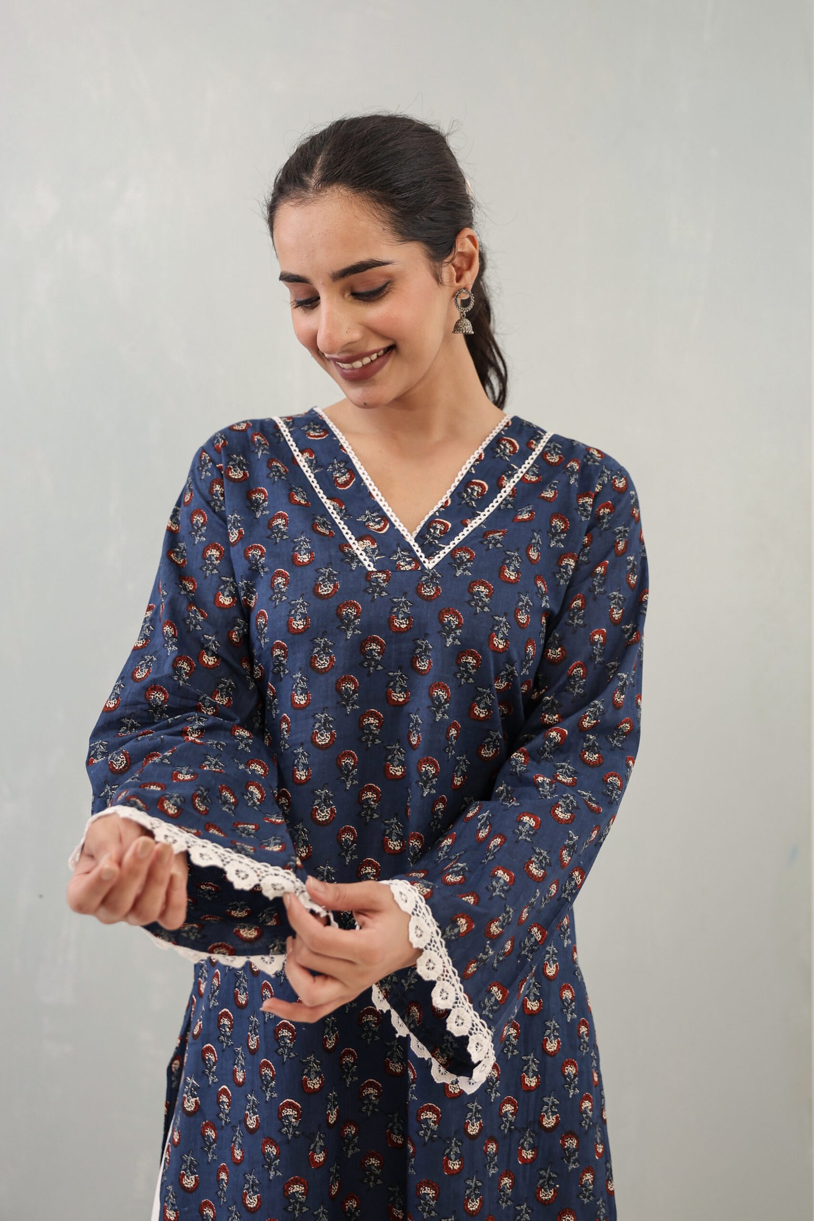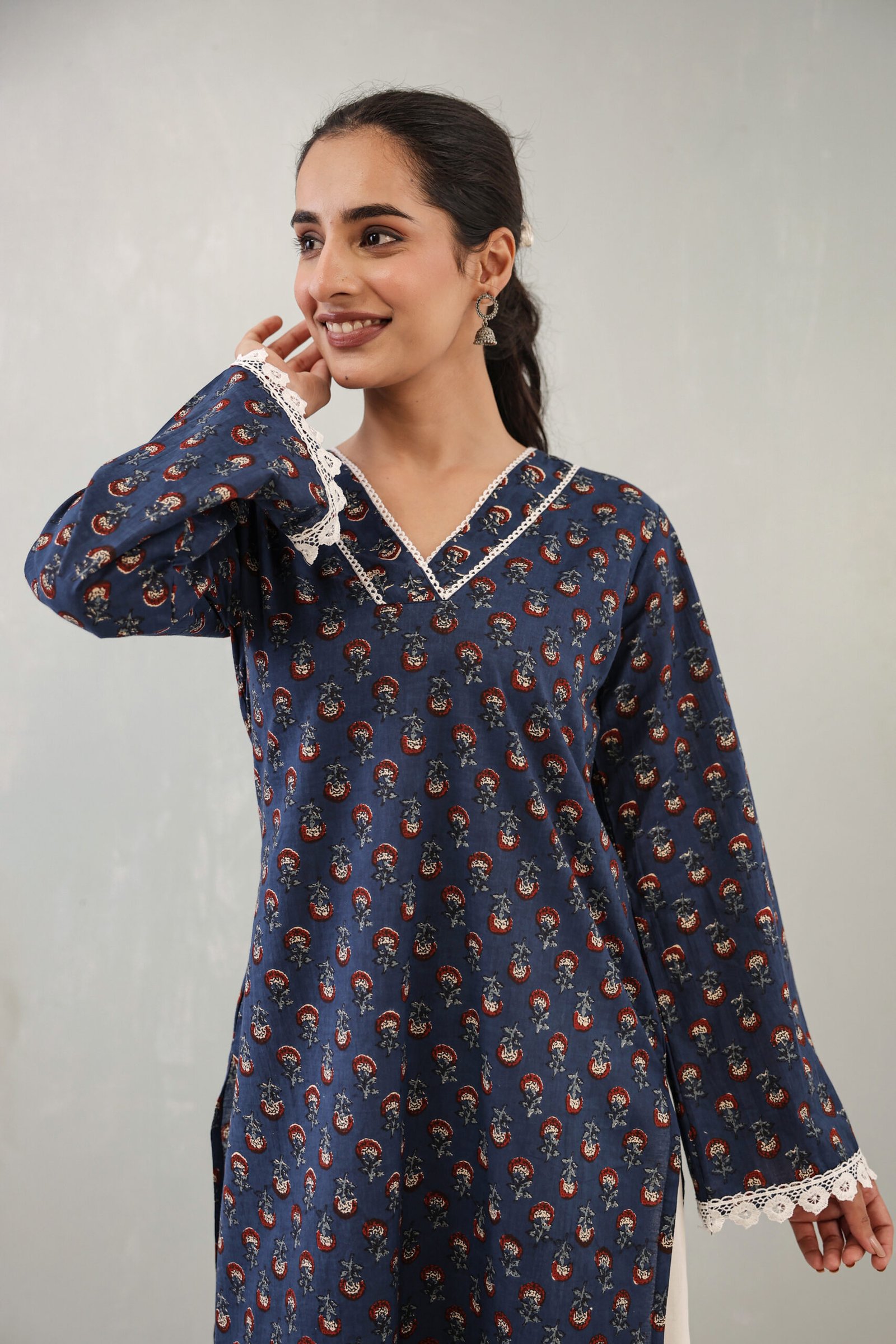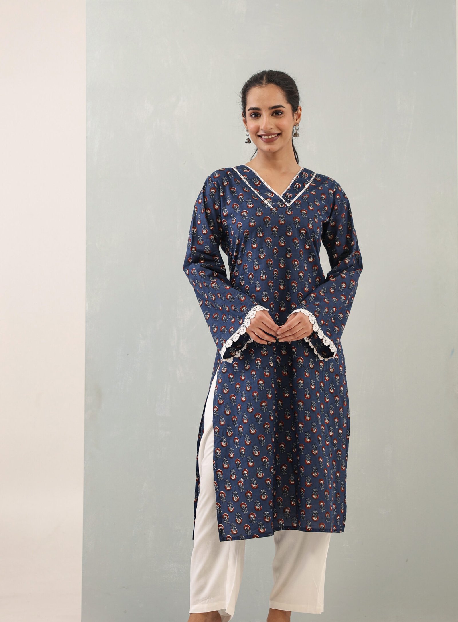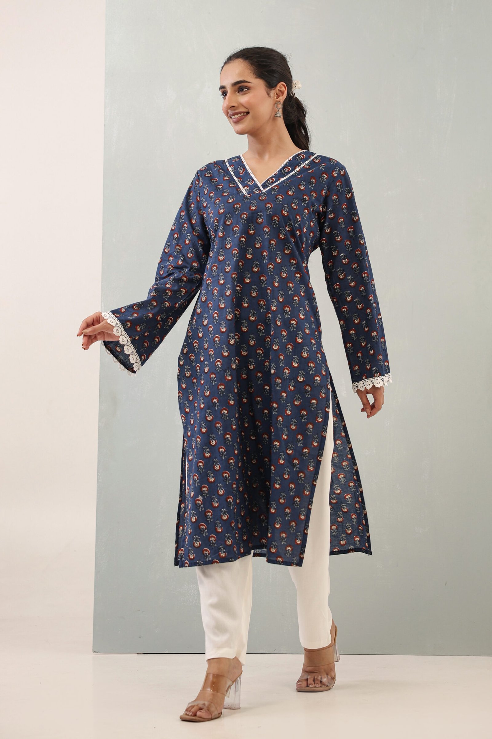 Elevate your everyday ethnic wardrobe with this Floral Printed Pakistani Kurti for Women, thoughtfully designed to blend timeless elegance with modern comfort. Crafted in a rich navy blue shade, this kurti features a flattering V-neckline enhanced with delicate lace detailing, adding a touch of sophistication to your look.
